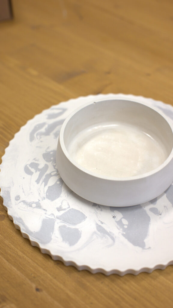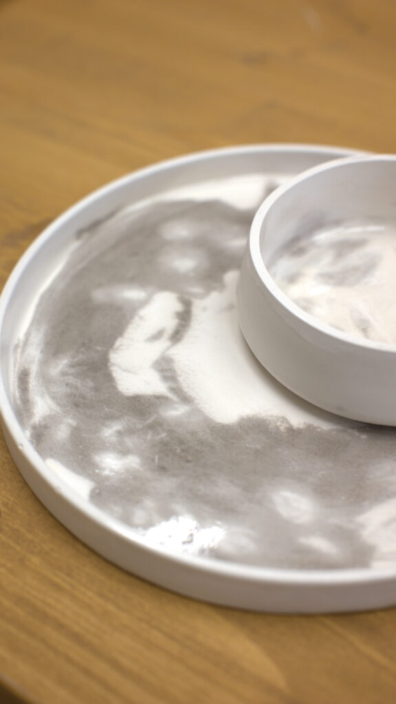 Väikese äärega kipsist valatud kandik ja kauss, et serveerida snäkke filmi kõrvale.